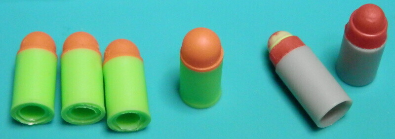弾頭がふかふかの柔らかい中空のゴム?またはEVAで、胴がちょっと硬めのEVAのようです。弾頭のすぐ後ろが直径:約6.6-6.7mm、胴の後端が直径:約6.9-7.0mm(約0.5mm幅のリム)。