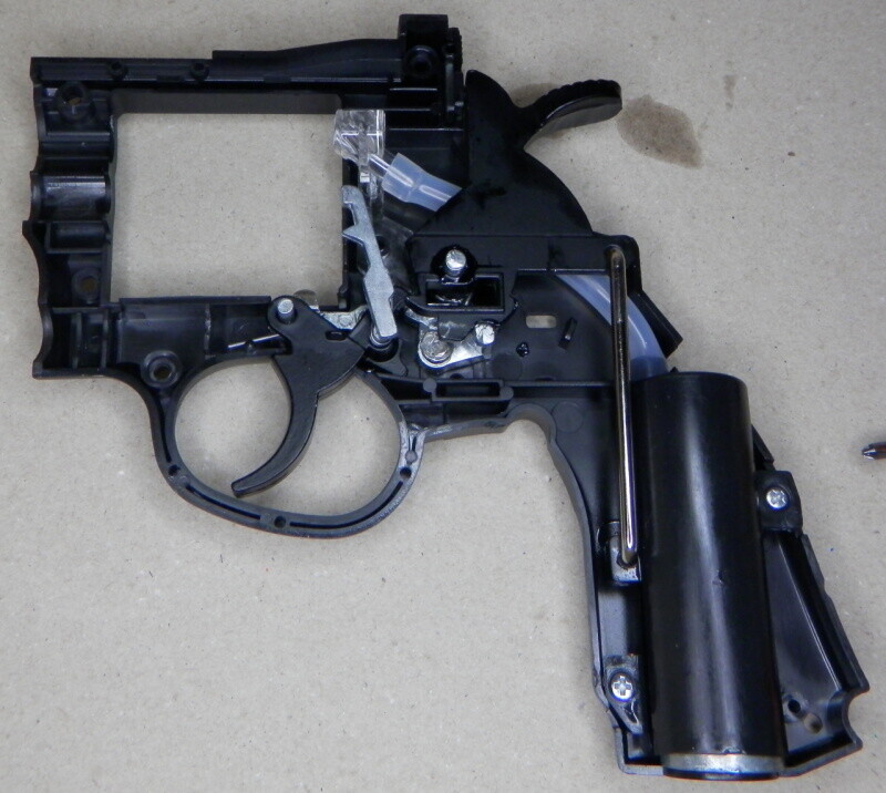 フォーシングコーンとインナーバレルはゲルボール用の自作のまま。フォーシングコーンの入口を面取りカッターで広げたり表面を磨いたり、スプリングの断面の角を研磨してグリスを塗ったり・・・その他、シリンダーの回転やスイングイン&アウトなどの動作がスムーズになるように加工をしました。