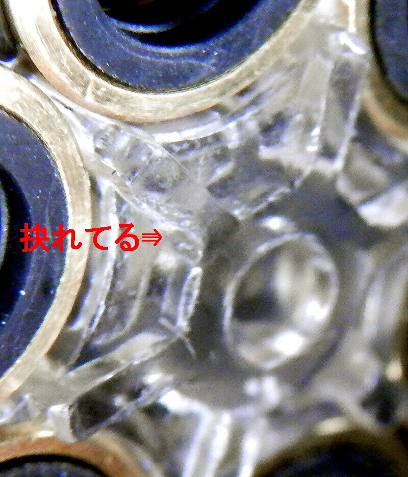 これ多分、銃口を少し上に向けるだけでカートリッジのせいで回りにくいという症状に気づかずに無理にトリガーを引いていた最初の頃の傷じゃないかと思います。一箇所だけじゃなくて6箇所全部に何らかの傷があります。「ZP-5コピー」のエキストラクターにも少し傷がありますが、まだマシ。「ZP-5コピー」の付属カートリッジでは引っかかりにくかったですからね。