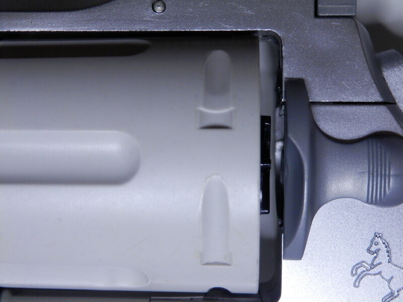 「ZP-5コピー」がいいと思ったのは、トリガー引くとカートリッジの先端がバレルの入口にほぼ接することだったんですけど、「XYL ZP-5 S&W PYTHON 357」はシリンダーの前の隙間が大きくて全然届かないみたいなんですよね。これの良し悪しはまた後でチェックします。