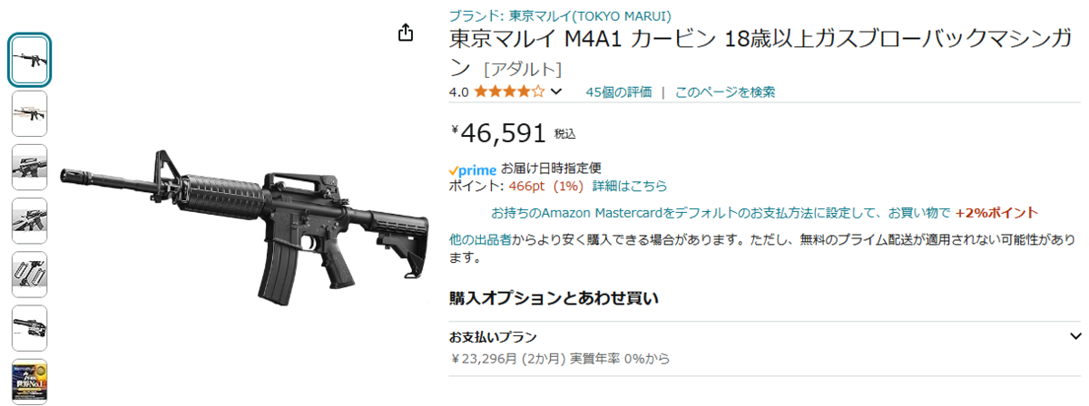 今回もモケイパドックの毎月1日の10%offを当てにしたんですが・・・まさか、「M4A1 カービン」が「M4A1 MWS」と同じ価格になっているとは思いませんでした。5千円くらい安いかと思ってました。よそで買おうかとも思ったんですが、色々条件が重なった結果、モケイパドックでの買い物に関しては楽天スーパーポイントが6%付く日となったので買うことに決めました。